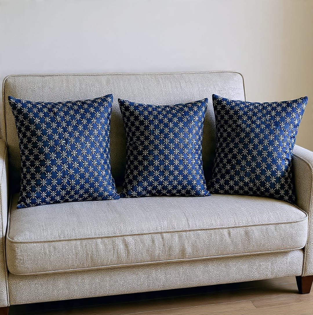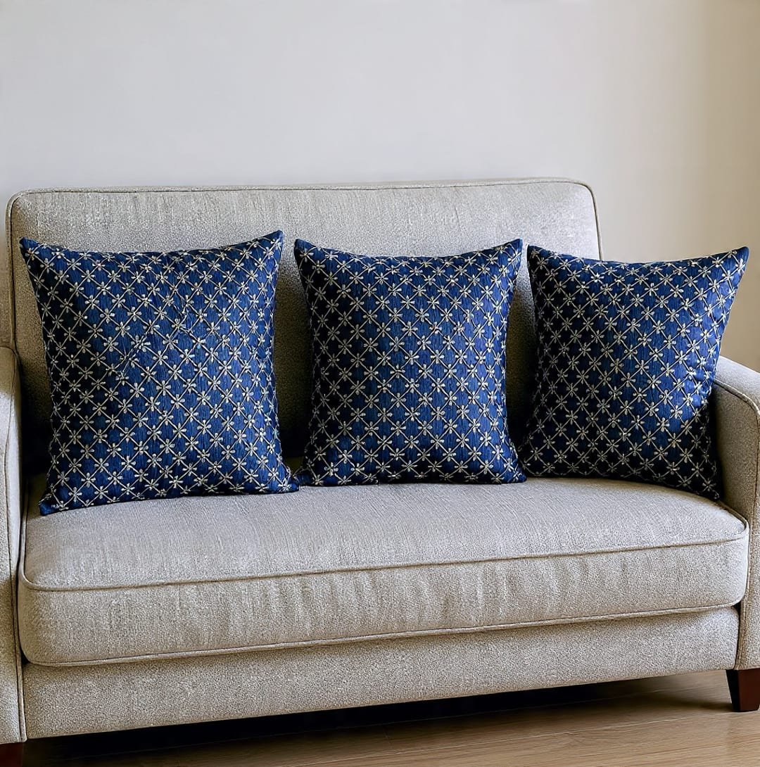 Enhance your living space with these elegant navy blue cushion covers featuring a beautifully detailed geometric embroidered pattern. The rich colour and intricate design bring a touch of luxury and sophistication to any sofa, bed, or lounge area. Crafted from high-quality fabric, these cushion covers offer both style and comfort, making them perfect for modern as well as traditional home décor.
