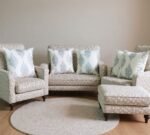 Each piece is crafted with plush cushioning for exceptional comfort and solid wooden legs that add a touch of timeless charm. The included decorative throw pillows feature a refined white and soft blue motif, perfectly complementing the upholstery while adding an extra layer of texture and visual interest.