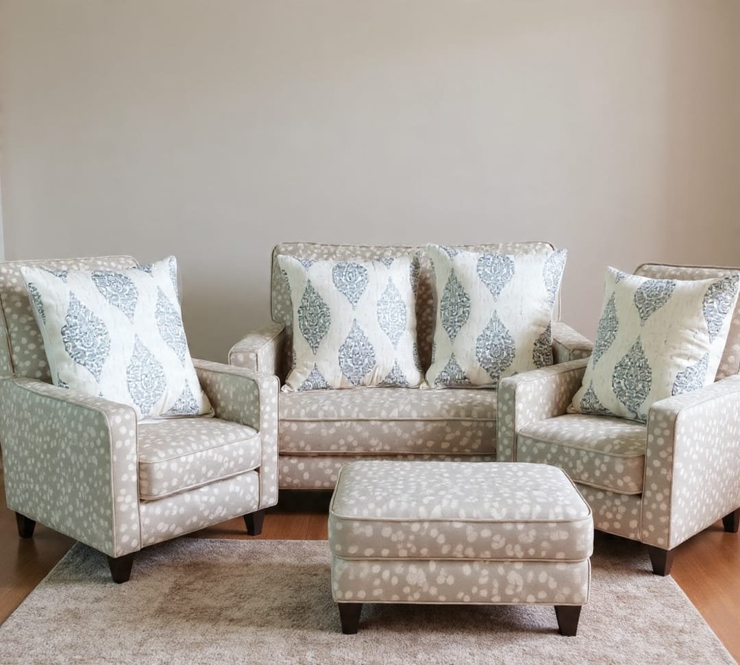 Transform your living space with this elegant upholstered living room set, designed to blend comfort, style, and subtle sophistication. The set features a three-seater sofa, two matching armchairs, and a cozy ottoman, all upholstered in a soft beige fabric with a delicate, modern dotted pattern. The neutral tones make it easy to pair with any interior style—from contemporary to classic.