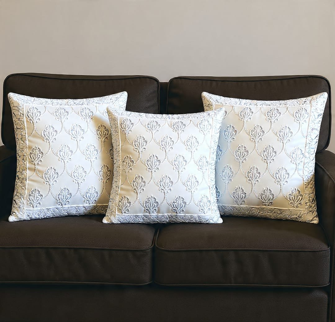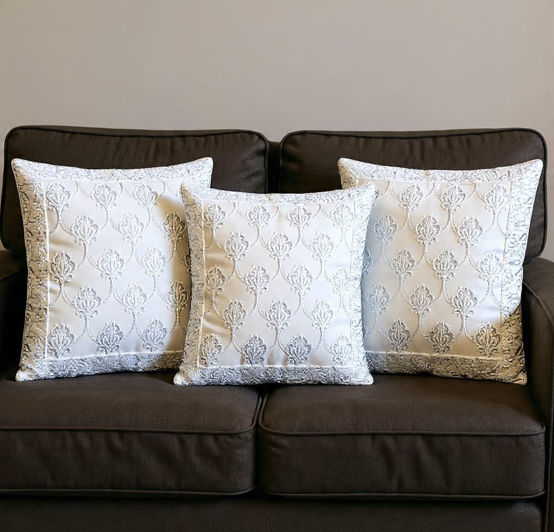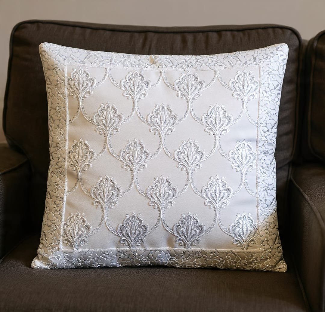 Bring a touch of luxury into your home with this elegant Decor By Mom Premium Jacquard Cushion Cover. Crafted in a beautiful silvery white tone, the cover features intricate raised jacquard patterns that create a rich, royal look. Its shimmering fabric and detailed floral motifs add sophistication and charm, making it a perfect accent piece for living rooms, bedrooms, or lounge spaces.